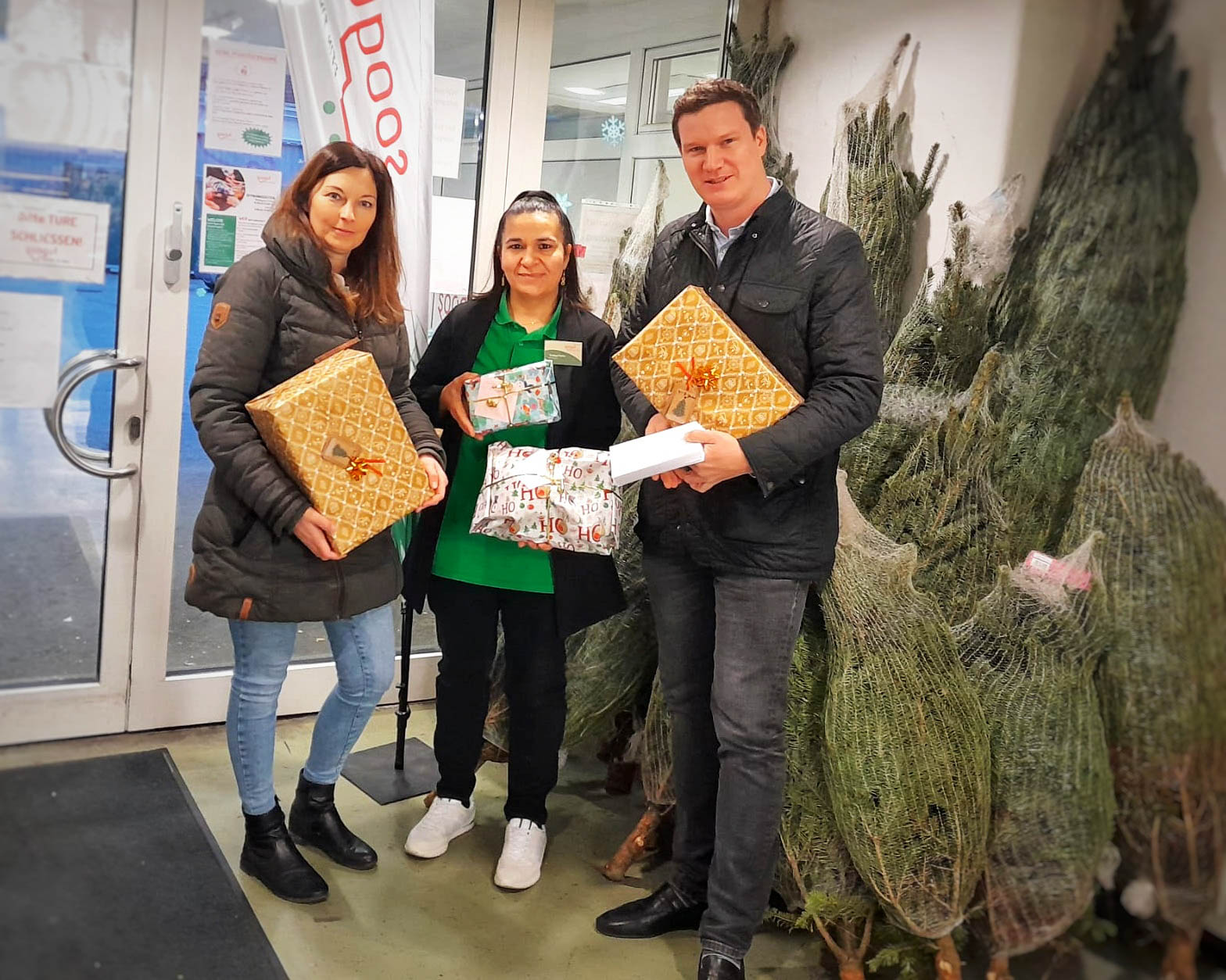 Freudestrahlend nahm Marktleiterin Yurdagül Sahin die bunten Päckchen von Florian Wurz (erweiterte Geschäftsleitung) und Margit Hofer (Marketing) entgegen.